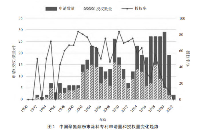 我國粉末涂料行業(yè)于20世紀(jì)70年代才開始起步,比國外晚了接近40年。圖2展示了中國聚氨酯粉末涂料專利申請量和授權(quán)量變化趨勢。由圖2可以看出,我國在該領(lǐng)域的專利申請始于1992年;1992—2017年,我國聚氨酯粉末涂料行業(yè)處于快速發(fā)展階段,專利申請數(shù)量總體呈現(xiàn)增長態(tài)勢,但期間出現(xiàn)兩次短暫波動;2017年后專利申請數(shù)量保持高水平穩(wěn)定,反映了我國聚氨酯粉末涂料行業(yè)進(jìn)入技術(shù)成熟期。雖然我國聚氨酯粉末涂料行業(yè)的起步較晚,但是專利申請量一直保持穩(wěn)定,這側(cè)面反映了該行業(yè)在我國依然有較大市場前景和重要科研價值。