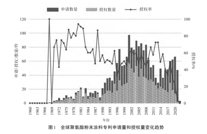 國外粉末涂料行業(yè)起步較早,國外企業(yè)于20世紀(jì)30年代開始粉末涂料生產(chǎn)技術(shù)的研發(fā),20 世紀(jì)50年代末粉末涂料進(jìn)入高速發(fā)展階段,20世紀(jì)70年代后,粉末涂料品種逐漸豐富并開始在高端涂裝市場應(yīng)用。圖1展示了全球聚氨酯粉末涂料專利申請量和授權(quán)量變化趨勢。由圖1可以看出,全球范圍內(nèi),聚氨酯粉末涂料的相關(guān)專利申請開始于1968年;1968—2001年,專利申請數(shù)量呈現(xiàn)迅速增長態(tài)勢,2001年達(dá)到峰值;2001—2008 年,專利申請數(shù)量保持高水平穩(wěn)定,反映了聚氨酯粉末涂料行業(yè)進(jìn)入技術(shù)成熟期;2008年后專利申請數(shù)量開始減少,并于2013年達(dá)到最低值,這反映了聚氨酯粉末涂料產(chǎn)品經(jīng)過多年發(fā)展遇到技術(shù)瓶頸,科研主體的創(chuàng)新熱情降低;2013—2021年,專利申請量有所回升,反映了聚氨酯粉末涂料技術(shù)獲得突破,參與創(chuàng)新的主體數(shù)量增加。與此同時,專利授權(quán)率于1968—2018年穩(wěn)定在40%~80%范圍內(nèi),2018年后授權(quán)率逐年下降,跌破40%,2021年下降至 4.26%, 這反映了科研主體間同質(zhì)化競爭激烈,專利申請量大但創(chuàng)新不足。