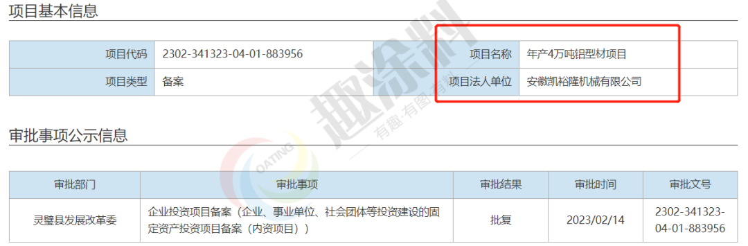 2023年2月14日,安徽凱裕隆機(jī)械有限公司,年產(chǎn)4萬(wàn)噸鋁型材項(xiàng)目,在靈璧縣發(fā)展改革委,進(jìn)行企業(yè)投資項(xiàng)目備案。