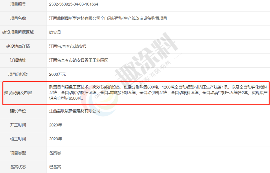 2023年2月14日,江西鑫聯(lián)晟新型建材有限公司,全自動(dòng)鋁型材生產(chǎn)線改造設(shè)備購(gòu)置項(xiàng)目,進(jìn)行企業(yè)項(xiàng)目備案。
