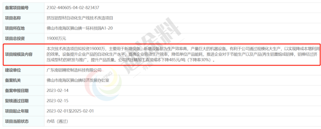 2023年2月15日,廣東南鋁精密制造科技有限公司,擠壓鋁型材自動(dòng)化生產(chǎn)線技術(shù)改造項(xiàng)目,在佛山市南海區(qū)獅山鎮(zhèn)經(jīng)濟(jì)發(fā)展辦公室,進(jìn)行企業(yè)項(xiàng)目備案。