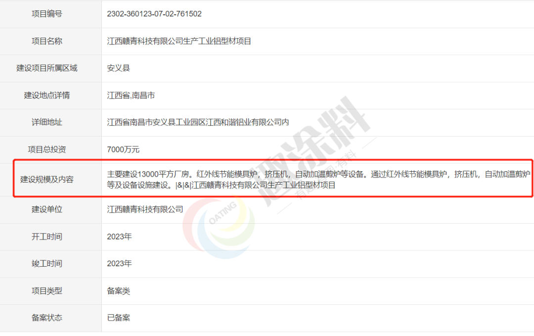 2023年2月20日,江西贛青科技有限公司,生產(chǎn)工業(yè)鋁型材項(xiàng)目,進(jìn)行企業(yè)項(xiàng)目備案。