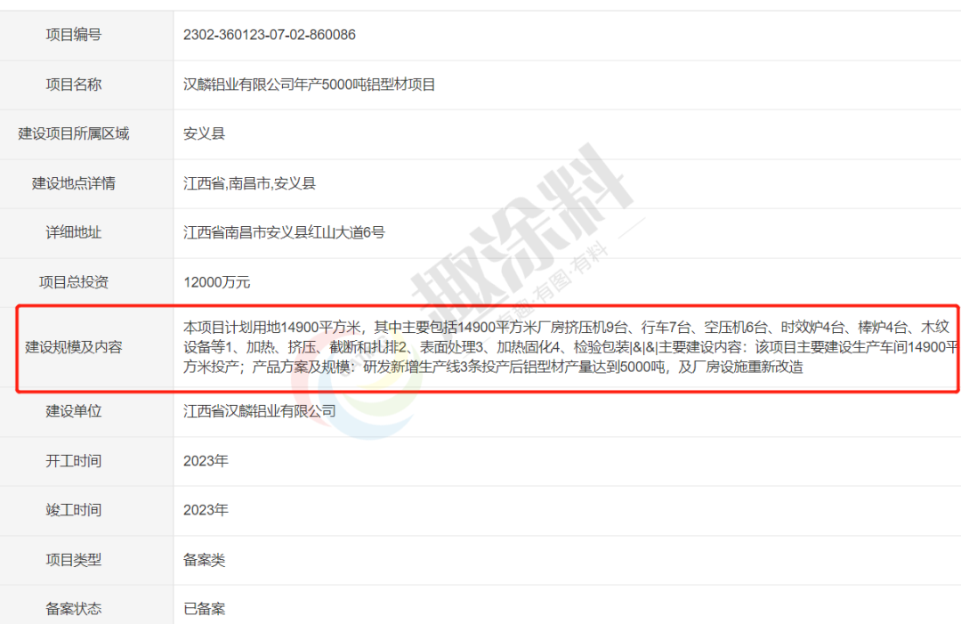 2023年2月2日,江西省漢麟鋁業(yè)有限公司,年產(chǎn)5000噸鋁型材項(xiàng)目,進(jìn)行項(xiàng)目備案。