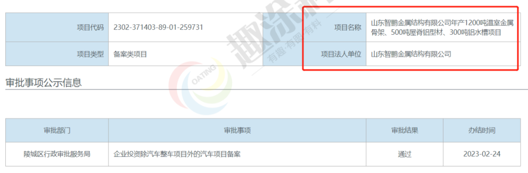 2023年2月23日,山東智鵬金屬結(jié)構(gòu)有限公司,年產(chǎn)1200噸溫室金屬骨架、500噸屋脊鋁型材、300噸鋁水槽項(xiàng)目,在陵城區(qū)行政審批服務(wù)局,進(jìn)行企業(yè)投資除汽車(chē)整車(chē)項(xiàng)目外的汽車(chē)項(xiàng)目備案。