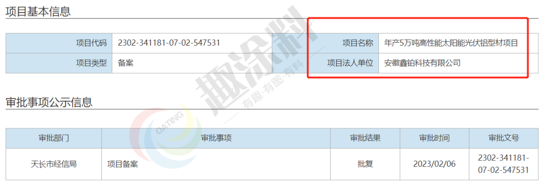 2023年2月6日,安徽鑫鉑科技有限公司,年產(chǎn)5萬(wàn)噸高性能太陽(yáng)能光伏鋁型材項(xiàng)目,在天長(zhǎng)市經(jīng)信局,進(jìn)行項(xiàng)目備案。