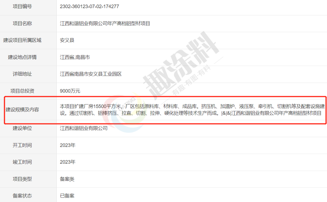2023年2月20日,江西和諧鋁業(yè)有限公司,年產(chǎn)高檔鋁型材項(xiàng)目,進(jìn)行企業(yè)項(xiàng)目備案。