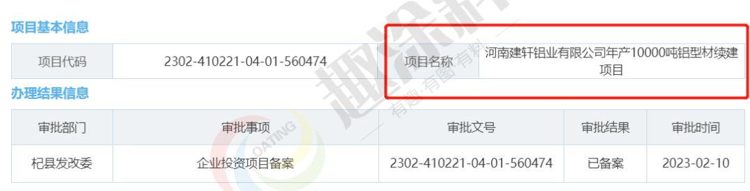 2023年2月10日,河南建軒鋁業(yè)有限公司,年產(chǎn)10000噸鋁型材續(xù)建項(xiàng)目,在杞縣發(fā)改委,進(jìn)行企業(yè)投資項(xiàng)目備案。