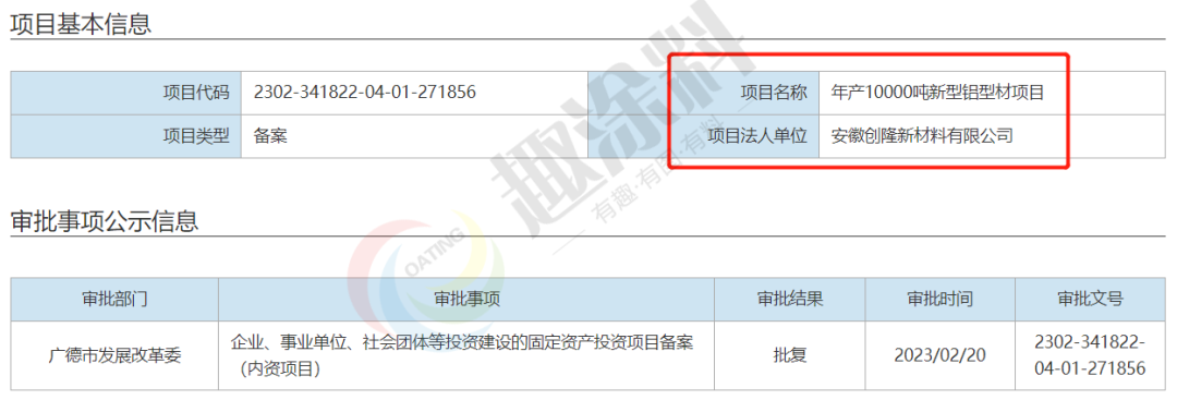 2023年2月20日,安徽創(chuàng)隆新材料有限公司,年產(chǎn)10000噸新型鋁型材項(xiàng)目,在廣德市發(fā)展改革委,進(jìn)行企業(yè)、事業(yè)單位、社會(huì)團(tuán)體等投資建設(shè)的固定資產(chǎn)投資項(xiàng)目備案(內(nèi)資項(xiàng)目)。