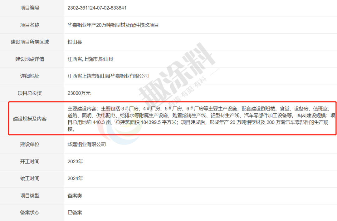 2023年2月13日,華嘉鋁業(yè)有限公司,年產(chǎn)20萬(wàn)噸鋁型材及配件技改項(xiàng)目,進(jìn)行企業(yè)項(xiàng)目備案。