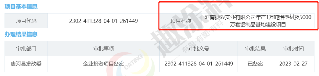 2023年2月27日,河南擷彩實(shí)業(yè)有限公司,年產(chǎn)1萬(wàn)噸鋁型材及5000萬(wàn)套鋁制品基地建設(shè)項(xiàng)目,在唐河縣發(fā)改委,進(jìn)行企業(yè)投資項(xiàng)目備案。