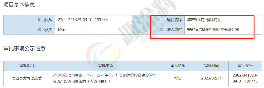 2023年2月14日,安徽漢浩捷訊機(jī)械科技有限公司,年產(chǎn)6萬(wàn)噸鋁型材項(xiàng)目,在靈璧縣發(fā)展改革委,進(jìn)行企業(yè)投資項(xiàng)目備案。