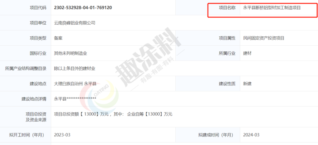 2023年2月17日,云南良峰鋁業(yè)有限公司,永平縣斷橋鋁型材加工制造項(xiàng)目,在永平縣發(fā)展改革局,進(jìn)行企業(yè)投資項(xiàng)目備案。