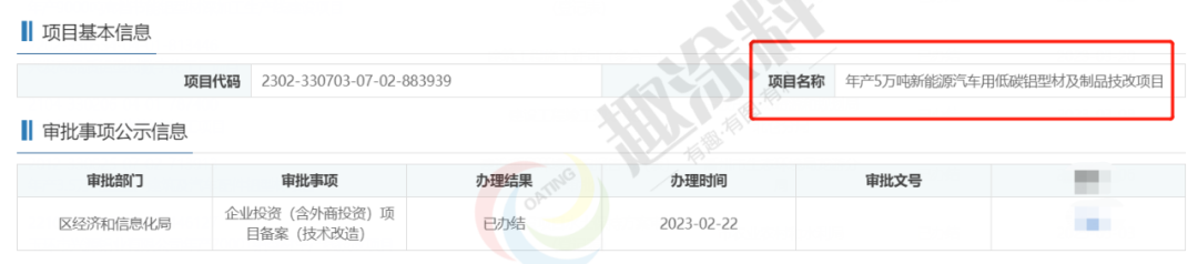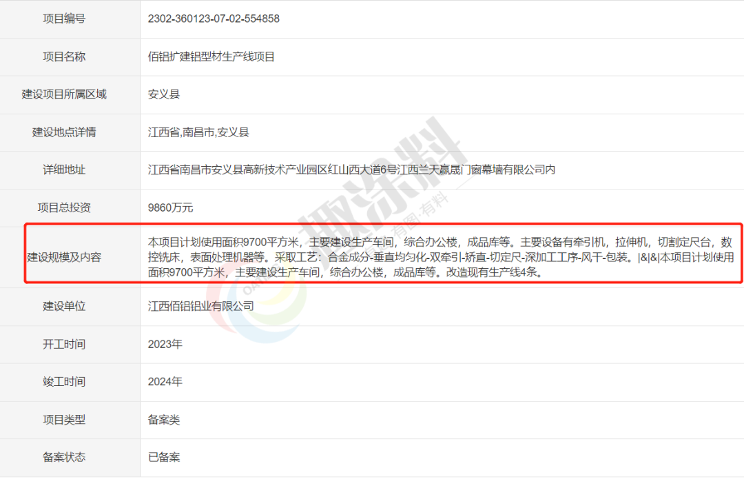 2023年2月23日,江西佰鋁鋁業(yè)有限公司,擴(kuò)建鋁型材生產(chǎn)線項(xiàng)目,進(jìn)行企業(yè)項(xiàng)目備案。