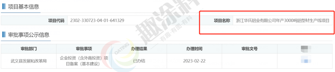 2023年2月22日,浙江華氏鋁業(yè)有限公司,年產(chǎn)3000噸鋁型材生產(chǎn)線項(xiàng)目,在武義縣發(fā)展和改革局,進(jìn)行企業(yè)投資(含外商投資)項(xiàng)目備案(基本建設(shè))。