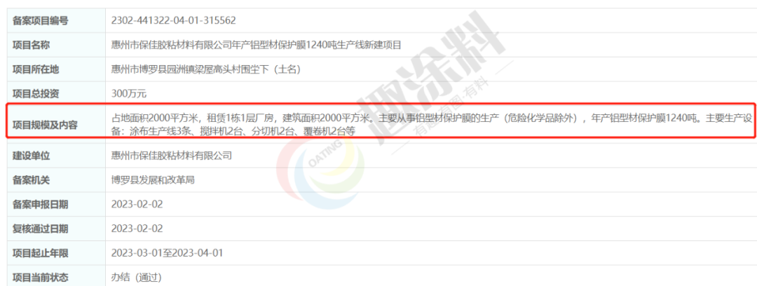 2023年2月2日,惠州市保佳膠粘材料有限公司,年產(chǎn)鋁型材保護(hù)膜1240噸生產(chǎn)線新建項(xiàng)目,在博羅縣發(fā)展和改革局,進(jìn)行項(xiàng)目備案。