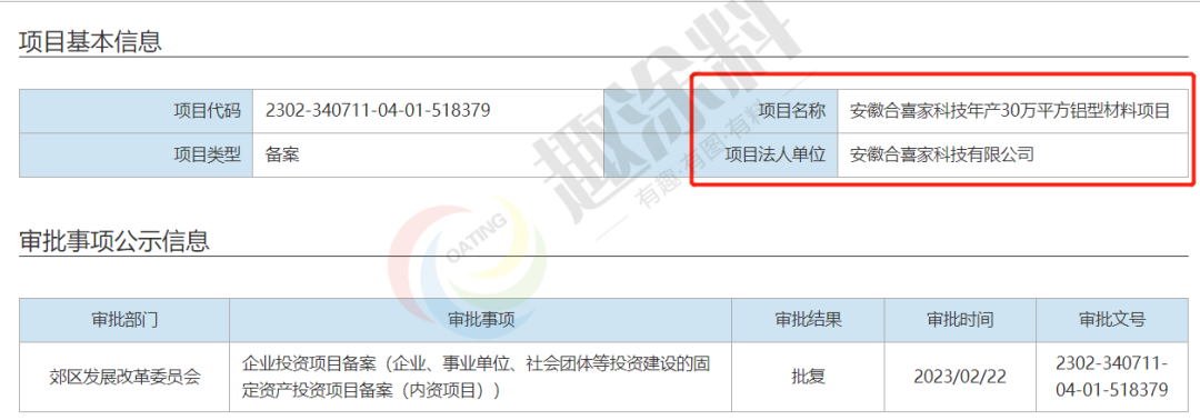 2023年2月22日,安徽合喜家科技有限公司,年產(chǎn)30萬(wàn)平方鋁型材料項(xiàng)目,在郊區(qū)發(fā)展改革委員會(huì),進(jìn)行企業(yè)投資項(xiàng)目備案。