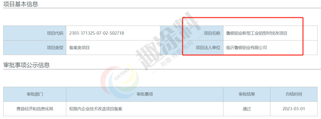 2023年2月28日,臨沂魯銀鋁業(yè)有限公司,新型工業(yè)鋁型材技改項(xiàng)目,在費(fèi)縣經(jīng)濟(jì)和信息化局,申請(qǐng)進(jìn)行權(quán)限內(nèi)企業(yè)技術(shù)改造項(xiàng)目備案。