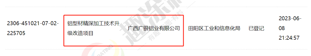 2023年6月8日,廣西廣銀鋁業(yè)有限公司,鋁型材精深加工技術(shù)升級改造項目,在田陽區(qū)工業(yè)和信息化局,進(jìn)行企業(yè)項目備案。