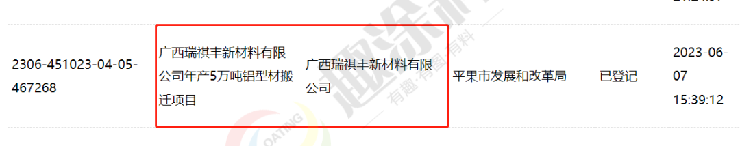 2023年6月7日,廣西瑞祺豐新材料有限公司,年產(chǎn)5萬噸鋁型材搬遷項目,在平果市發(fā)展和改革局,進(jìn)行企業(yè)項目備案。