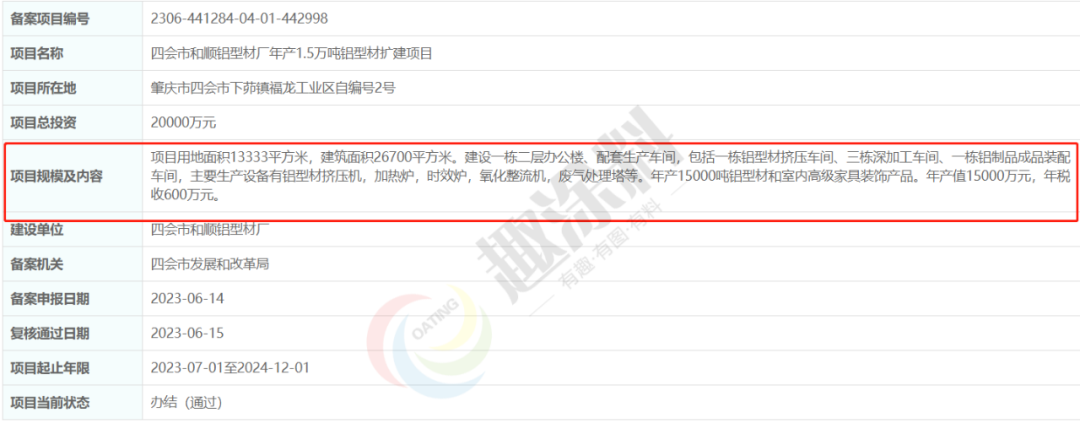 2023年6月15日,四會市和順鋁型材廠,年產(chǎn)1.5萬噸鋁型材擴建項目,在四會市發(fā)展和改革局,進(jìn)行企業(yè)投資項目備案。
