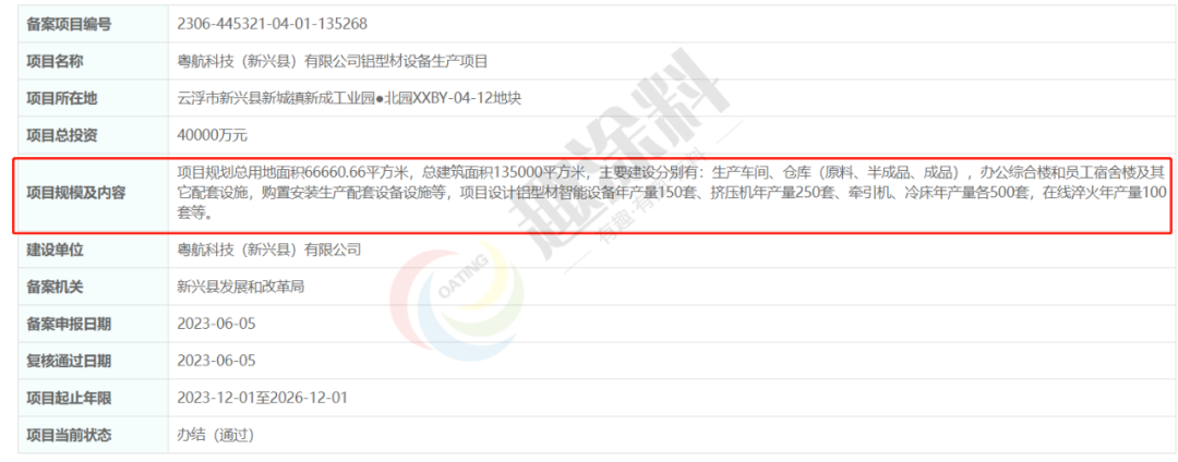 2023年6月5日,粵航科技(新興縣)有限公司,鋁型材設(shè)備生產(chǎn)項目,在新興縣發(fā)展和改革局,進(jìn)行企業(yè)項目備案。