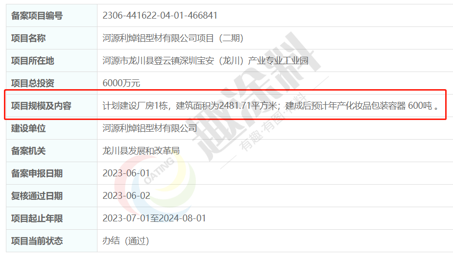 2023年6月2日,河源利焯鋁型材有限公司,項目(二期),在龍川縣發(fā)展和改革局,進(jìn)行企業(yè)項目備案。