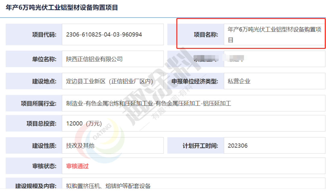 2023年6月12日,陜西正信鋁業(yè)有限公司,年產(chǎn)6萬噸光伏工業(yè)鋁型材設(shè)備購置項目,進(jìn)行企業(yè)項目備案。