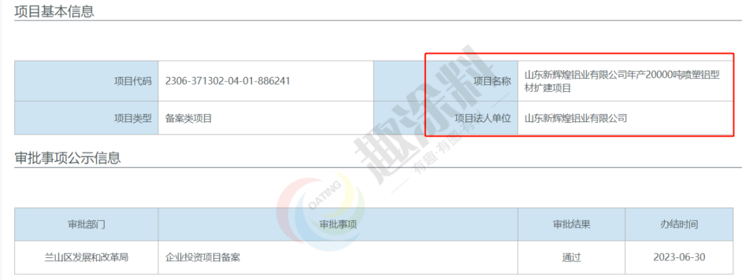 2023年6月30日,山東新輝煌鋁業(yè)有限公司,年產(chǎn)20000噸噴塑鋁型材擴建項目,在蘭山區(qū)發(fā)展和改革局,進(jìn)行企業(yè)投資項目備案。