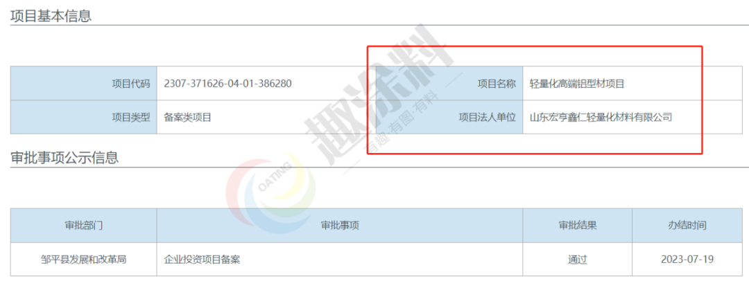 2023年6月25日,山東宏亨鑫仁輕量化材料有限公司,輕量化高端鋁型材項目,在鄒平縣發(fā)展和改革局,進(jìn)行企業(yè)投資項目備案。