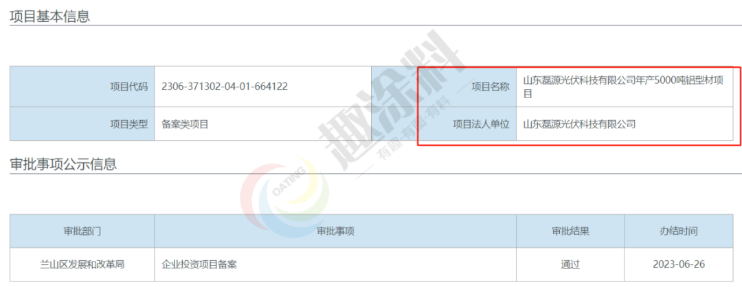 2023年6月26日,山東磊源光伏科技有限公司,年產(chǎn)5000噸鋁型材項目,在蘭山區(qū)發(fā)展和改革局,進(jìn)行企業(yè)投資項目備案。