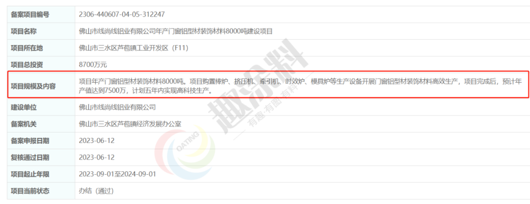 2023年6月12日,佛山市線尚線鋁業(yè)有限公司,年產(chǎn)門窗鋁型材裝飾材料8000噸建設(shè)項目,在佛山市三水區(qū)蘆苞鎮(zhèn)經(jīng)濟發(fā)展辦公室,進(jìn)行企業(yè)項目備案。