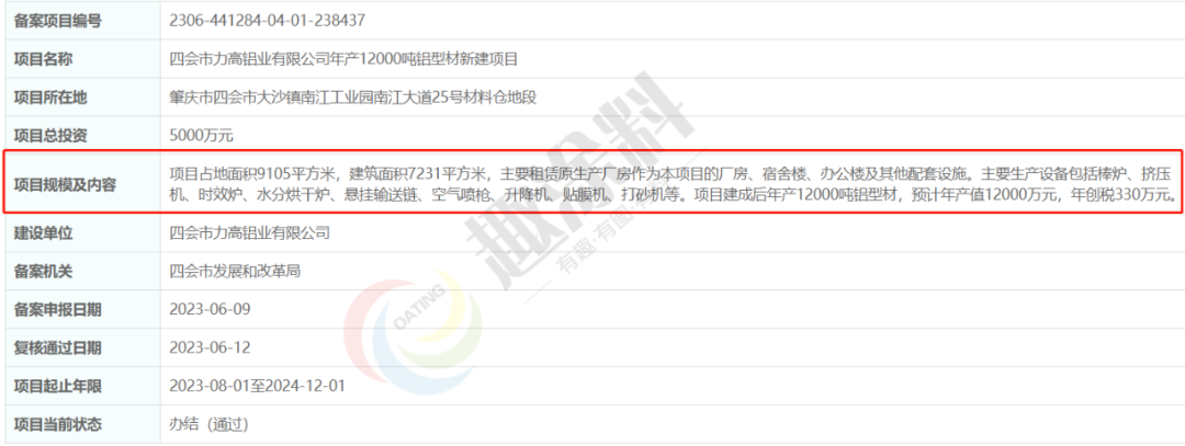 2023年6月12日,四會市力高鋁業(yè)有限公司,年產(chǎn)12000噸鋁型材新建項目,在四會市發(fā)展和改革局,進(jìn)行企業(yè)項目備案。