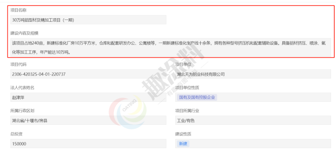 2023年6月28日,湖北天為鋁業(yè)科技有限公司,30萬噸鋁型材及精加工項目(一期),進(jìn)行企業(yè)投資項目備案。