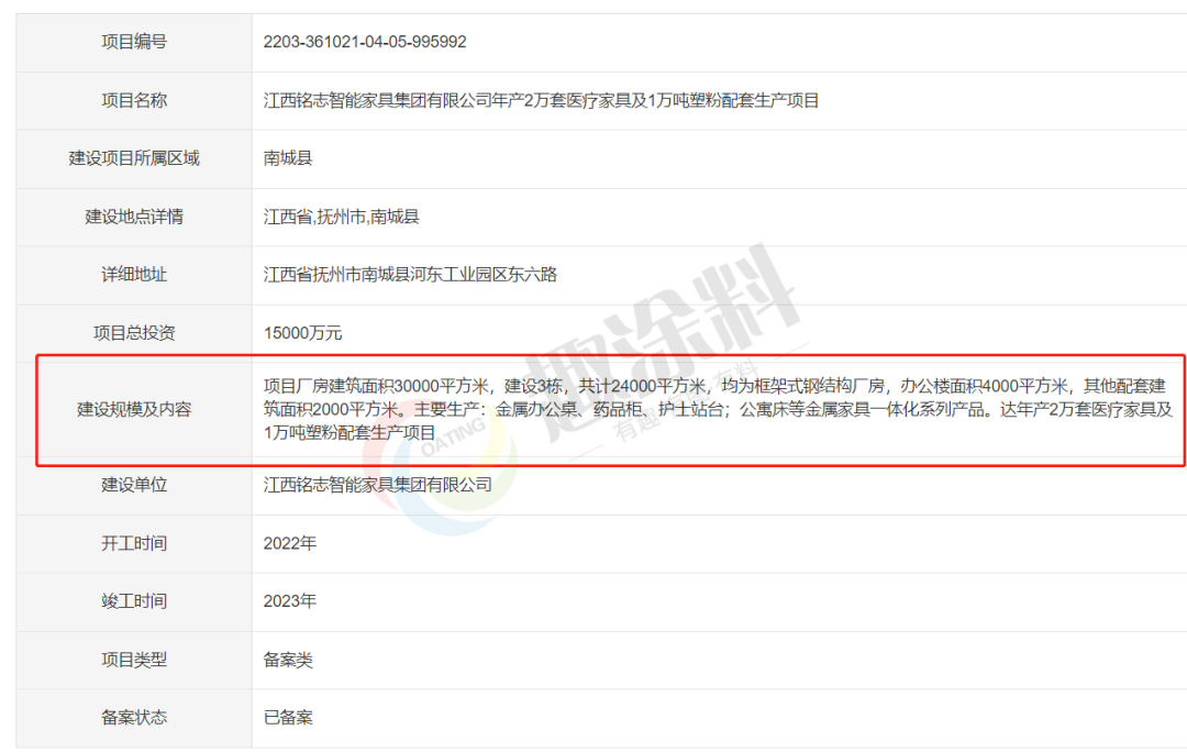 2023年7月14日,江西銘志智能家具集團有限公司,年產(chǎn)2萬套醫(yī)療家具及1萬噸塑粉配套生產(chǎn)項目,進行企業(yè)項目備案。