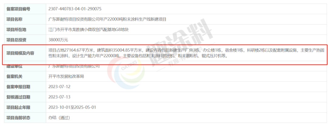 2023年7月13日,廣東斯耐特項目投資有限公司,年產(chǎn)22000噸粉末涂料生產(chǎn)線新建項目,在開平市發(fā)展和改革局,進行企業(yè)項目備案。