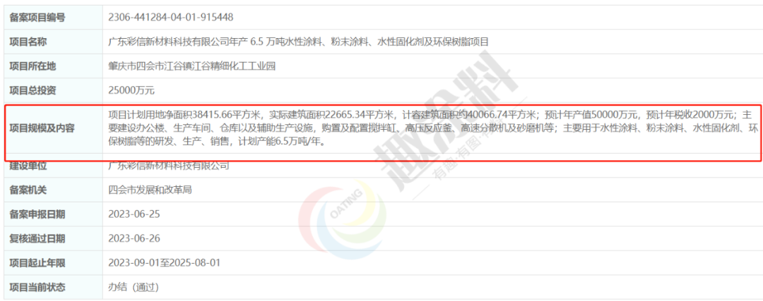 2023年6月26日,廣東彩信新材料科技有限公司,年產(chǎn) 6.5 萬噸水性涂料、粉末涂料、水性固化劑及環(huán)保樹脂項目,在四會市發(fā)展和改革局,進行企業(yè)項目備案。