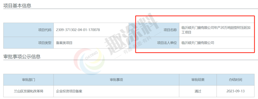 2023年9月11日,臨沂碩天門窗有限公司,年產(chǎn)20萬噸鋁型材壓延加工項(xiàng)目,在蘭山區(qū)發(fā)展和改革局,進(jìn)行企業(yè)投資項(xiàng)目備案。