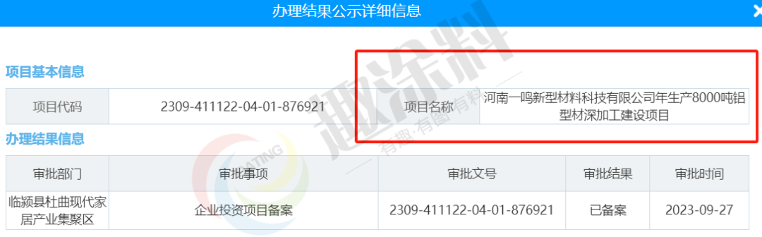 2023年9月27日,河南一鳴新型材料科技有限公司,年生產(chǎn)8000噸鋁型材深加工建設(shè)項(xiàng)目,在臨潁縣杜曲現(xiàn)代家居產(chǎn)業(yè)集聚區(qū),進(jìn)行企業(yè)投資項(xiàng)目備案。