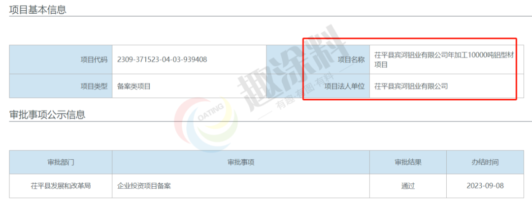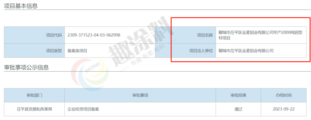 2023年9月22日,聊城市茌平區(qū)金麥鋁業(yè)有限公司,年產(chǎn)2000噸鋁型材項(xiàng)目,在茌平縣發(fā)展和改革局,進(jìn)行企業(yè)投資項(xiàng)目備案。