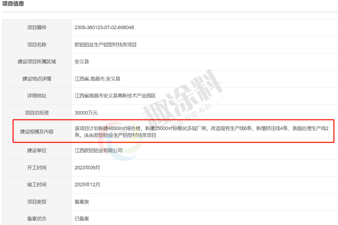 2023年9月8日,江西歐鋁鋁業(yè)有限公司,生產(chǎn)鋁型材技改項(xiàng)目,進(jìn)行企業(yè)項(xiàng)目備案。