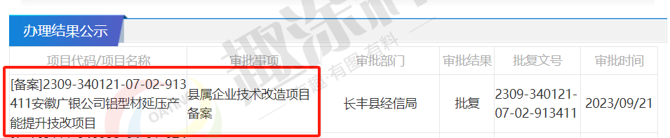 2023年9月21日,安徽廣銀鋁業(yè)有限公司,鋁型材延壓產(chǎn)能提升技改項(xiàng)目,在長豐縣經(jīng)信局,進(jìn)行縣屬企業(yè)技術(shù)改造項(xiàng)目備案。