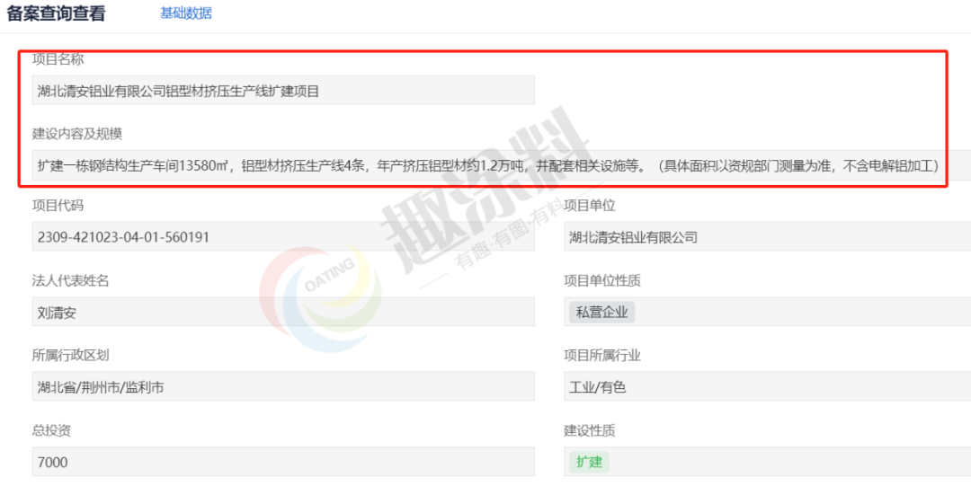 2023年9月21日,湖北清安鋁業(yè)有限公司,鋁型材擠壓生產(chǎn)線擴(kuò)建項(xiàng)目,進(jìn)行企業(yè)投資項(xiàng)目備案。