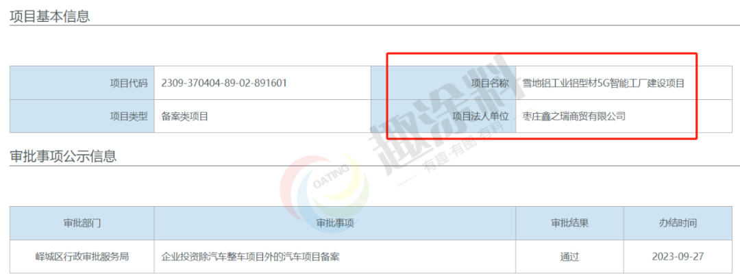2023年9月25日,棗莊鑫之瑞商貿(mào)有限公司,雪地鋁工業(yè)鋁型材5G智能工廠建設(shè)項(xiàng)目,在嶧城區(qū)行政審批服務(wù)局,進(jìn)行企業(yè)投資除汽車整車項(xiàng)目外的汽車項(xiàng)目備案。