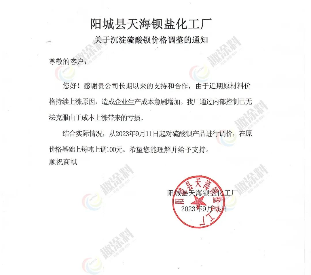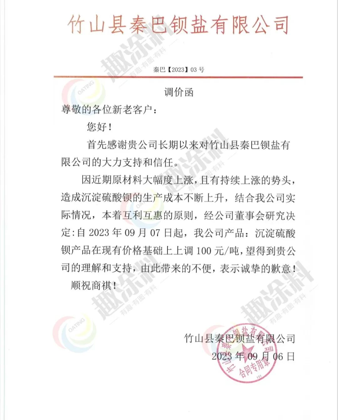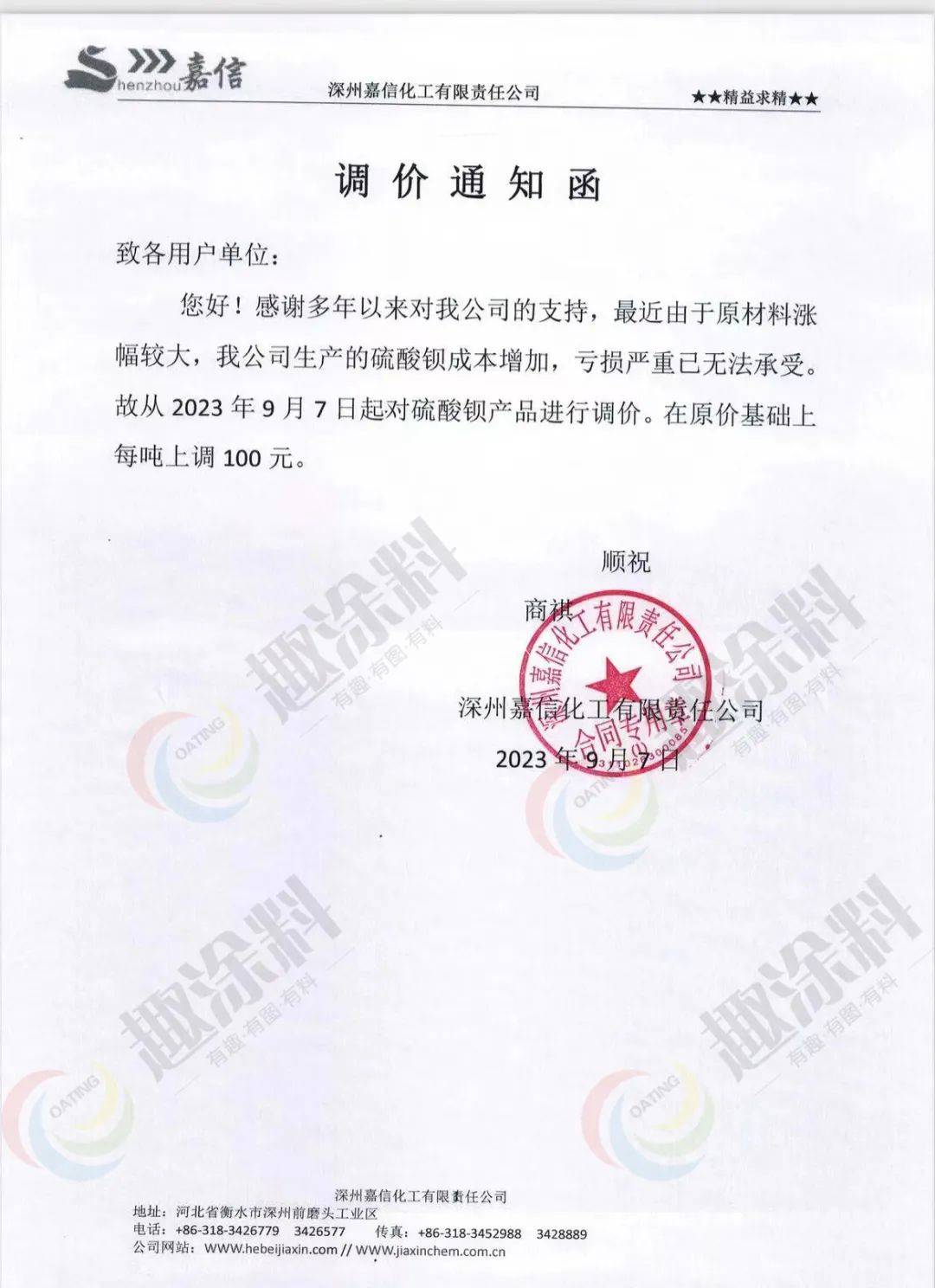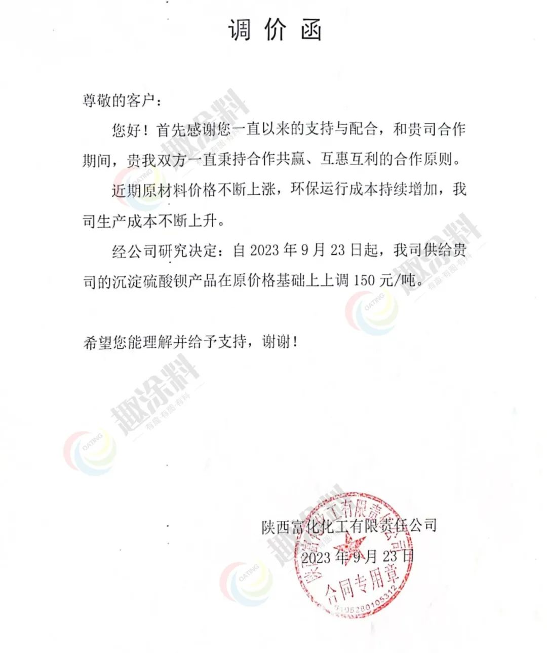 陜西富化化工有限責(zé)任公司宣布,近期原材料價格不斷上漲,環(huán)保運(yùn)行成本持續(xù)增加,我司生產(chǎn)成本不斷上升。經(jīng)公司研究決定:自2023年9月23日起,我司供給貴司的沉淀硫酸鋇產(chǎn)品在原價格基礎(chǔ)上上調(diào)150元/噸。