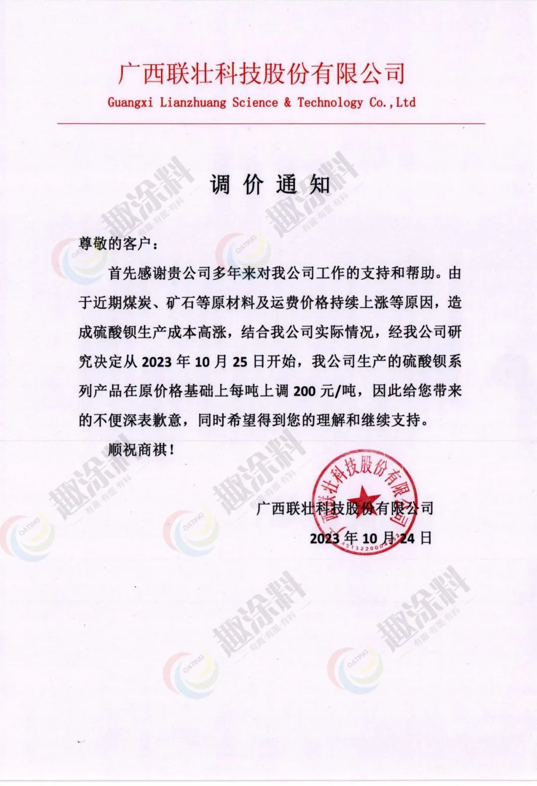 廣西聯(lián)壯科技股份有限公司宣布,由于近期煤炭、礦石等原材料及運(yùn)費(fèi)價格持續(xù)上漲等原因,造成硫酸鋇生產(chǎn)成本高漲,結(jié)合公司實(shí)際情況,經(jīng)公司研究決定從2023年10月25日開始,公司生產(chǎn)的硫酸鋇系列產(chǎn)品在原價格基礎(chǔ)上每噸上調(diào)200元/噸。