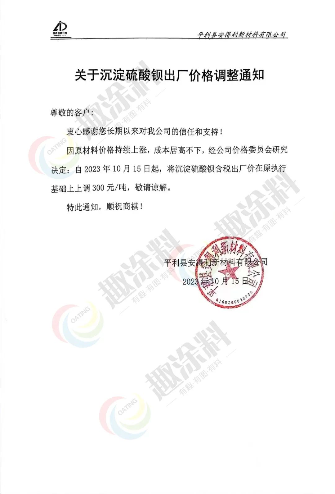 平利縣安得利新材料有限公司宣布,因原材料價格持續(xù)上漲,成本居高不下,經(jīng)公司價格委員會研究決定:自2023年10月15日起,將沉淀硫酸鋇含稅出廠價在原執(zhí)行基礎(chǔ)上上調(diào)300元/噸。