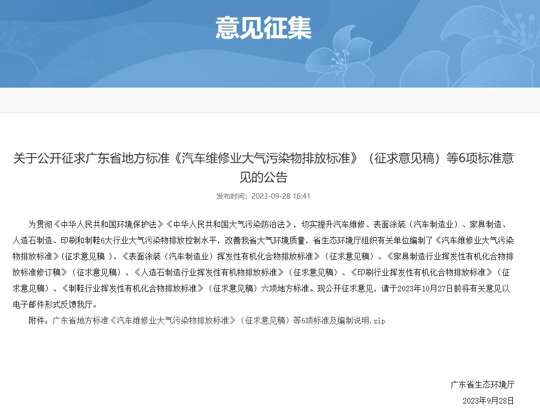 日前,為貫徹《中華人民共和國環(huán)境保護法》《中華人民共和國大氣污染防治法》,切實提升汽車維修、表面涂裝(汽車制造業(yè))、家具制造、人造石制造、印刷和制鞋6大行業(yè)大氣污染物排放控制水平,廣東省生態(tài)環(huán)境廳組織有關單位編制了《汽車維修業(yè)大氣污染物排放標準》(征求意見稿 )、《表面涂裝(汽車制造業(yè))揮發(fā)性有機化合物排放標準》(征求意見稿)、《家具制造行業(yè)揮發(fā)性有機化合物排放標準修訂稿》(征求意見稿)、《人造石制造行業(yè)揮發(fā)性有機物排放標準》(征求意見稿)、《印刷行業(yè)揮發(fā)性有機化合物排放標準》(征求意見稿)、《制鞋行業(yè)揮發(fā)性有機化合物排放標準》(征求意見稿)六項地方標準。