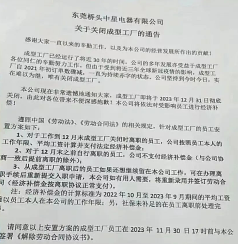 除此之外,位于東莞市橋頭鎮(zhèn)日資中星電器有限公司旗下成型工廠近期也宣布在年底徹底關(guān)閉。該公司發(fā)布通告稱,成型工廠已經(jīng)運行了將近30年的時間,公司的多年發(fā)展亦受益于成型工廠各位同仁的辛勤努力工作。但由于受到將近三年全球新冠疫情的影響,成型工廠自2021年初訂單數(shù)驟減,一直為持續(xù)赤字的狀態(tài)。公司堅持到今時今日,實在難以為繼,唯有關(guān)閉成型工廠。