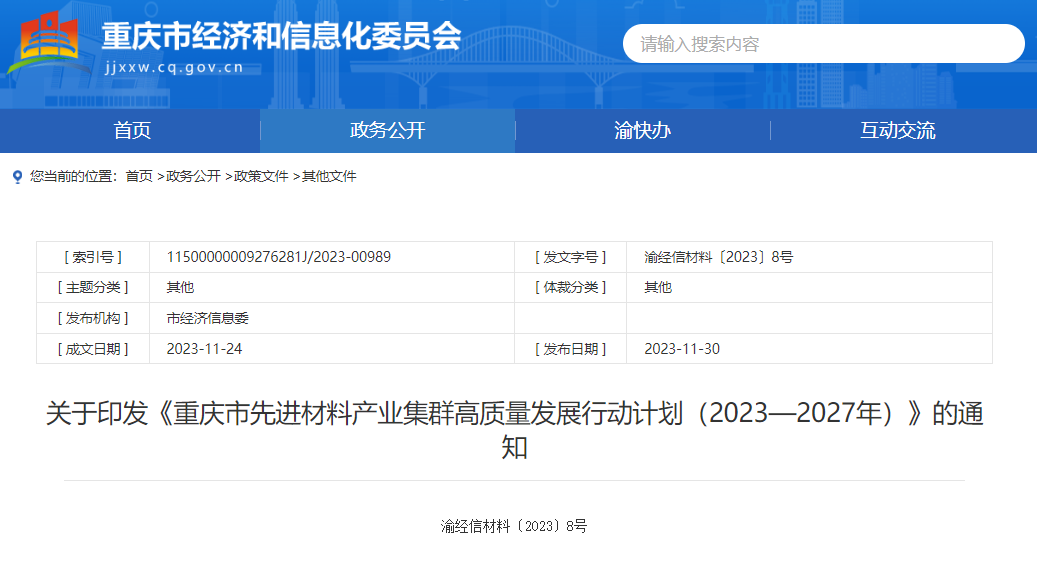 近日,重慶經(jīng)濟和信息化委員會印發(fā)《重慶市先進材料產(chǎn)業(yè)集群高質(zhì)量發(fā)展行動計劃(2023—2027年)》的通知(以下簡稱"通知")。