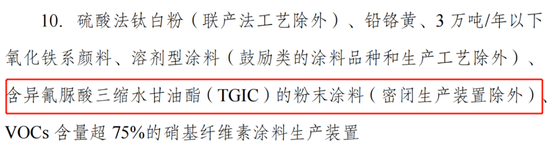 值得一提的是,2024年2月1日,我們粉末涂料人期盼已久的《產(chǎn)業(yè)結(jié)構(gòu)調(diào)整指導(dǎo)目錄(2024年本)》正式實施。在該文件中,之前涉及粉末涂料產(chǎn)品中的限制類“含異氰脲酸三縮水甘油酯(TGIC)的粉末涂料”調(diào)整為“含異氰脲酸三縮水甘油酯(TGIC)的粉末涂料(密閉生產(chǎn)裝置除外)”。
